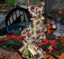 Cat Doll Family: There is a "Christmas" momma cat and 3 kittens sewn individually with decorations. The sizes are 14" high by 8" wide for mom and 7" high 7" wide. There are stuffed with fiber fill and they are the cutest things!. From Lucille Cummings. (HM)