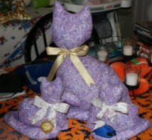 Cat Doll Family: There is a "Light purple floral with gold bow" momma cat and 2 kittens sewn individually with toys. The sizes are 14" high by 8" wide for mom and 7" high 7" wide. There are stuffed with fiber fill and they are the cutest things!. From Lucille Cummings. (HM)