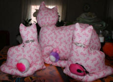 Cat Doll Family: There is a "Breast cancer awareness ribbon material with collars" momma cat and 2 kittens sewn individually with toys. The sizes are 13" high by 13" wide for mom and 7" high 7" wide kittens. There are stuffed with fiber fill and they are the cutest things!. From Lucille Cummings. (HM)