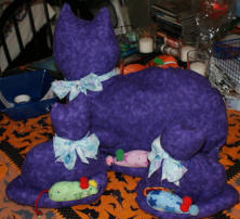 Cat Doll Family: There is a "Marbleized purple with pale blue bows" momma cat and 2 kittens sewn individually with toys. The sizes are 13" high by 13" wide for mom and 7" high 7" wide kittens. There are stuffed with fiber fill and they are the cutest things!. From Lucille Cummings. (HM)