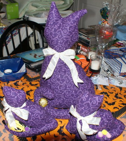 Cat Doll Family: There is a "Dark purple with white bows momma cat and 2 kittens" sewn individually with toys. The sizes are 13" high by 13" wide for mom and 7" high 7" wide kittens. There are stuffed with fiber fill and they are the cutest things!. From Lucille Cummings. (HM)