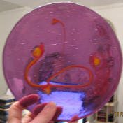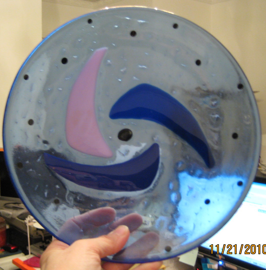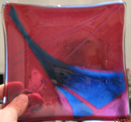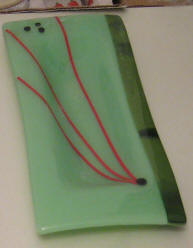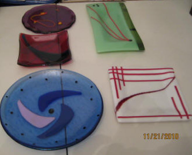 Fused glass dishes are made by cutting individual design pieces from sheets of glass. The design pieces are assembled on a double layer of glass and then everything is fired in a kiln at over 400 degrees. A second firing, at a lower temperature, "slumps" the dish shape into a mold. These are LEAD FREE and safe for food. The dishes are remarkable sturdy and can be used the same as any everyday china and they are dish washer safe. As with china, be cautious of quick temperature changes. (HM) From "Cat" in Canby.