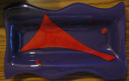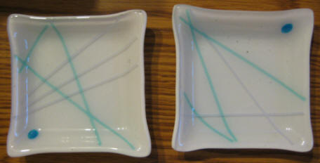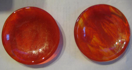Fused glass dishes are made by cutting individual design pieces from sheets of glass. The design pieces are assembled on a double layer of glass and then everything is fired in a kiln at over 400 degrees. A second firing, at a lower temperature, "slumps" the dish shape into a mold. These are LEAD FREE and safe for food. The dishes are remarkable sturdy and can be used the same as any everyday china and they are dish washer safe. As with china, be cautious of quick temperature changes. (HM) From "Cat" in Canby. She sent in $20.00 to help with postage on these dishes!!