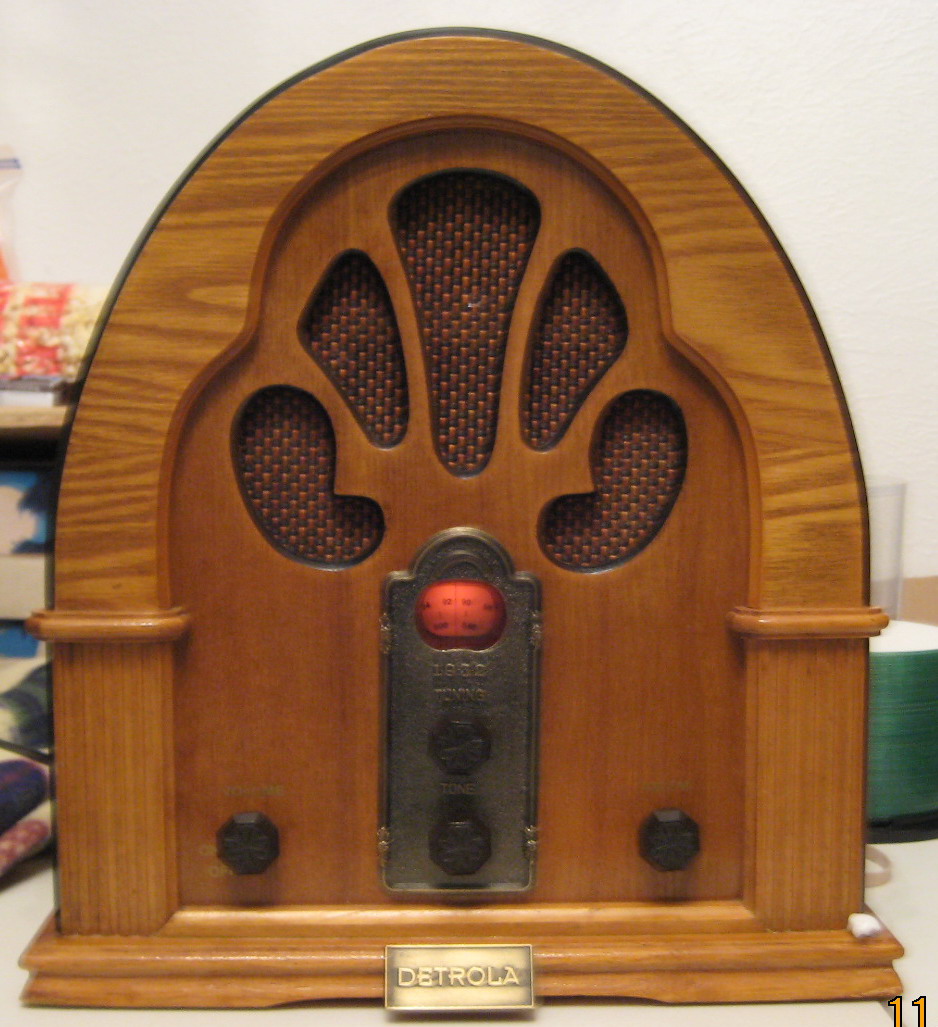 "Cathedral Radio" Detrola 14 inch high - 10 inches wide AM/FM Cassette player. The dial lights up. Works great. From Mike Handy. (CE)